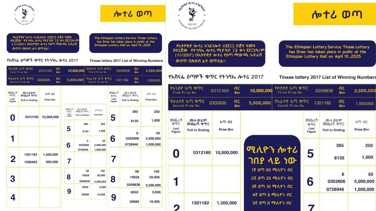 Tinsae Lottery 2017 National Lottery 2025 Winning Numbers Today The 1735th draw of the regular lottery was made today, April 02, 2017, at the Ethiopian Lottery Service at the Adal Hall, and the drawn numbers are attached herewith.   Addis Ababa resident and Ethio-Telecom sales employee Ato Eyuel Admasu won 4 million birr in the … Read more
